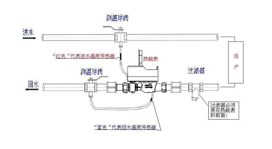 熱能量表屬于戶用精密儀表,安裝時必須小心,禁止提拽表頭、溫度傳感器線;禁止擠壓測溫探頭;嚴禁靠近高溫熱源以防電池爆炸傷人或損壞儀表。安裝前應反復過濾清除管內的麻絲、砂石等雜物,以免造成熱量表堵塞。安裝位置應避免曝曬、水淹、冰凍和污染且方便拆裝和抄表。